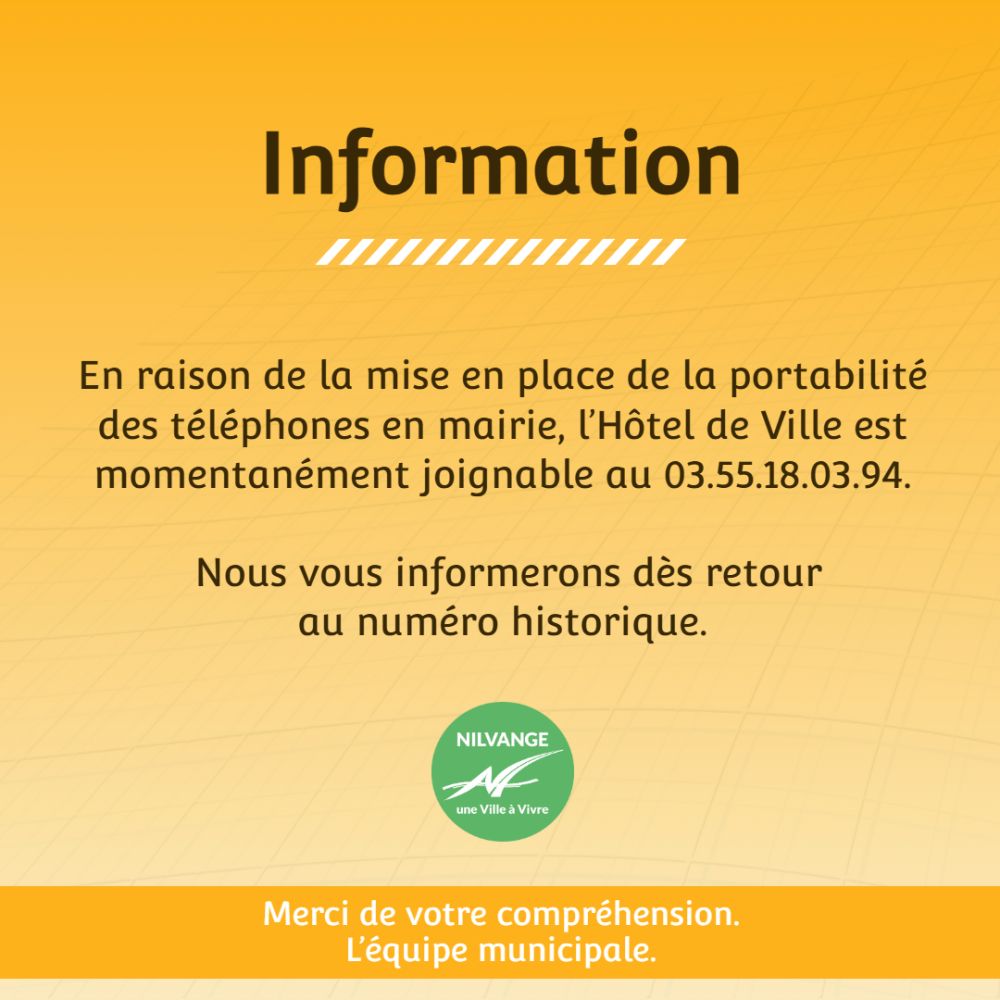 En raison de la mise en place de la portabilité des téléphones en mairie, l’Hôtel de Ville est momentanément joignable au 03.55.18.03.94.