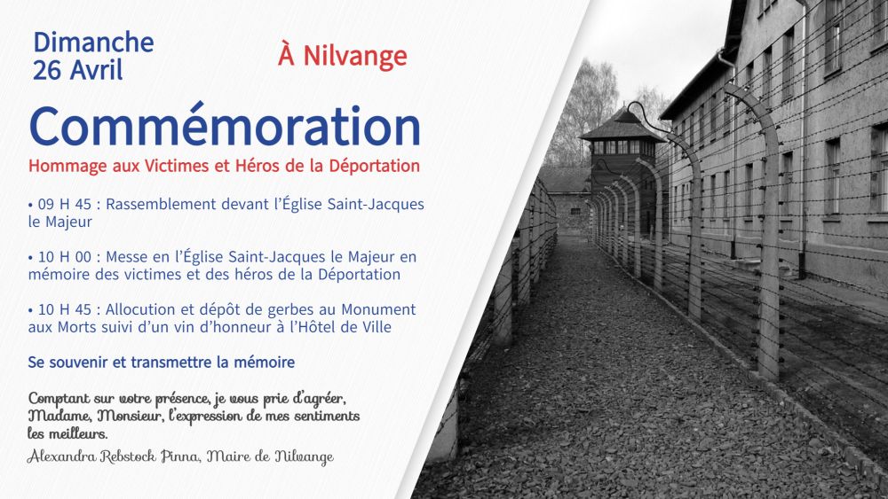À l’occasion de la Journée nationale du souvenir des victimes et des héros de la déportation, Madame le Maire et le Conseil municipal vous invitent à vous rassembler afin d’honorer la mémoire de celles et ceux qui ont souffert, résisté et péri dans les camps durant l’une des périodes les plus sombres de notre histoire.