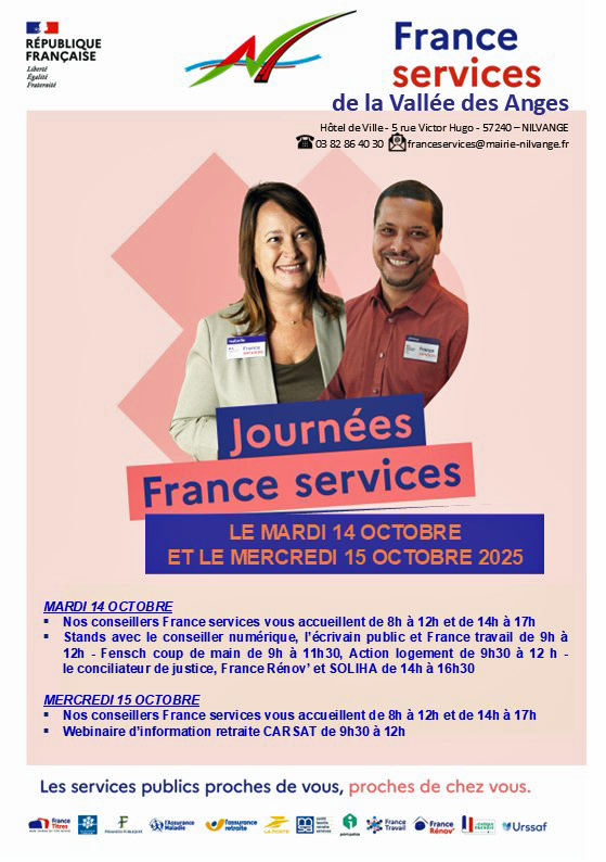 A l’occasion des journées portes ouvertes Nationales des France services, les agents France services de Nilvange vous accueillent le mardi 14 octobre et le mercredi 15 octobre 2025 de 8h à 12h et de 14h à 17h.